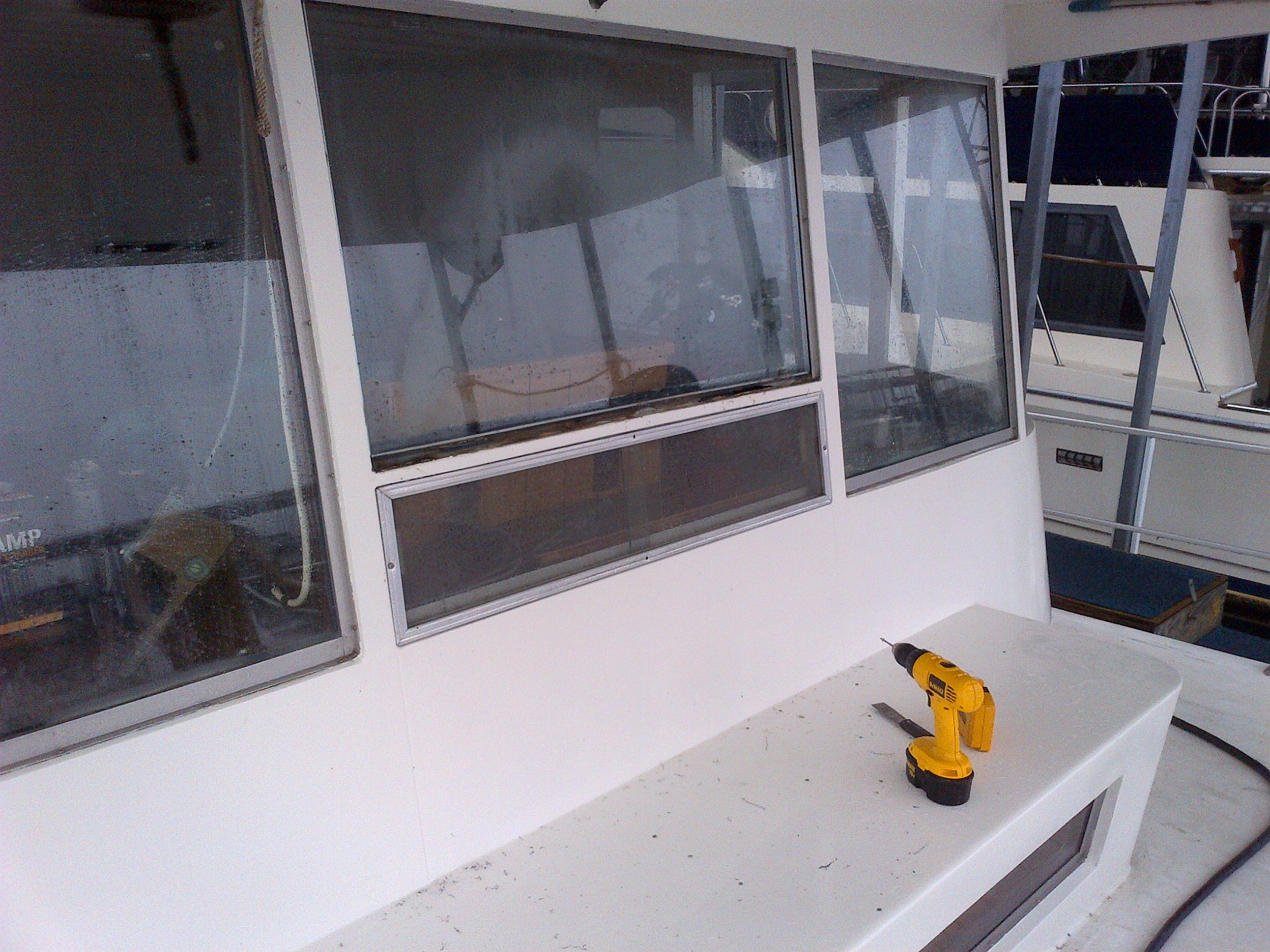 The job of replacing the pilot house window started out easy enough. Drill out the rivets, remove the trim pieces, cut loose the silicone caulking, gently push out the window into the ready hands of a helper. From there it went down hill.