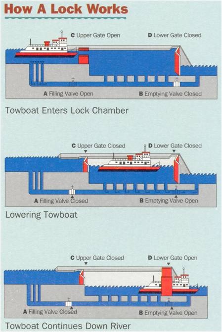 The lock is the river’s equivalent of an elevator that transfers a vessel from one side of a dam to the other. A lock consists of a concrete chamber with gates on either end. The size of the lock chamber varies from dam to dam but is typically 110 feet wide with lengths varying from 300 to 1000 feet.