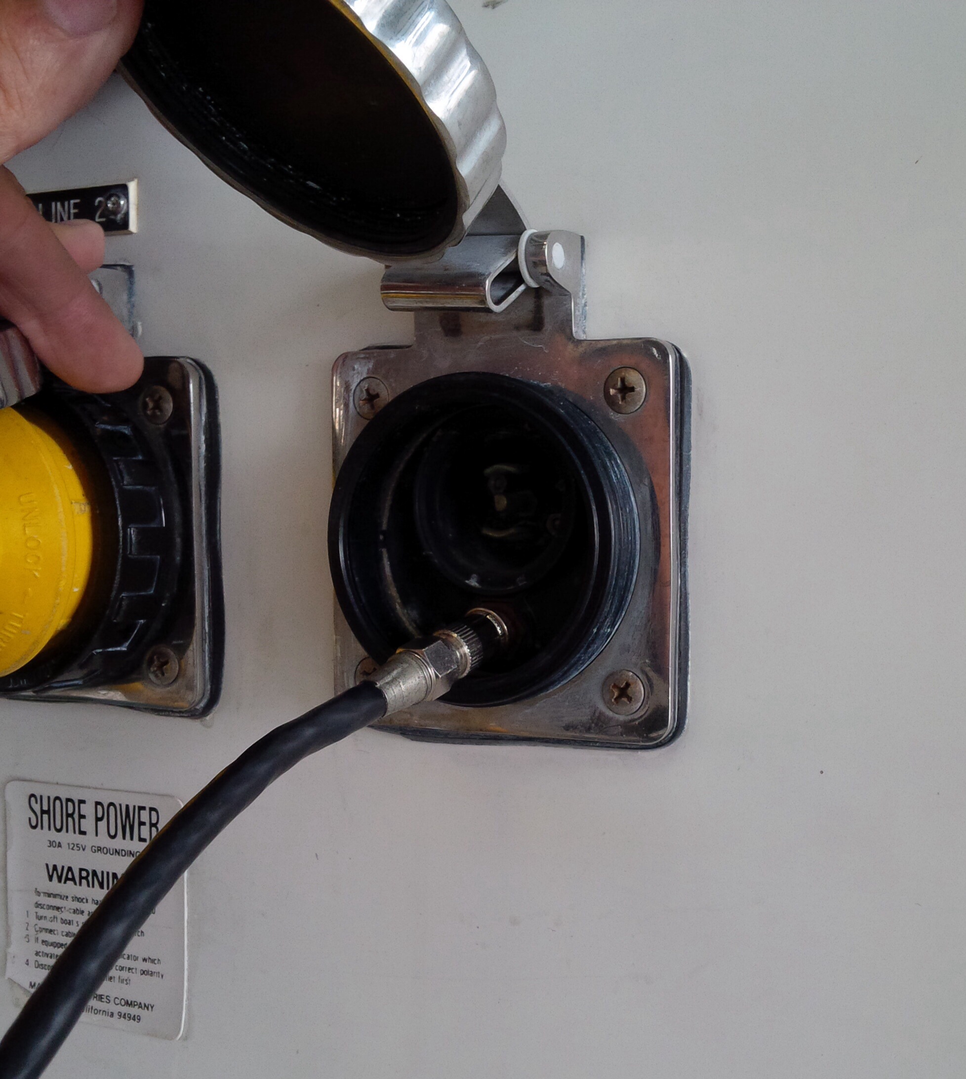 We confirmed that the cable inlet was functioning which was a relief as they are expensive. We also tested each of the cables and splitter fittings in the system and boiled the source of the problem down to the cable that runs from the inlet up through the wall to the front of the boat. Oh well. My initial guess was correct. But as you can see Molly is not impressed: