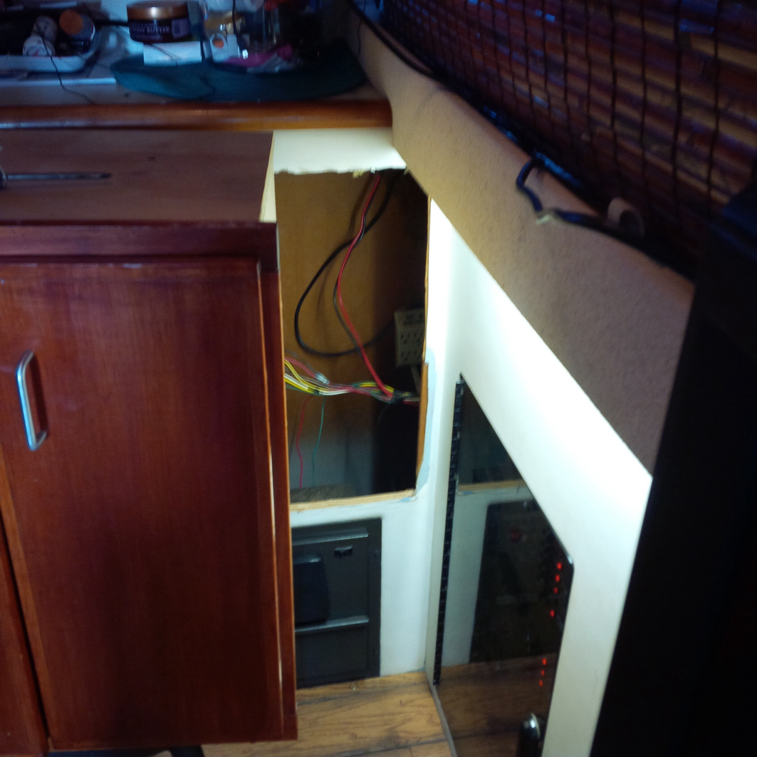 We shut off the power before we opened up the electrical panel to see about routing the cable through that area. We also removed a cabinet to give us access to the remaining pathway.