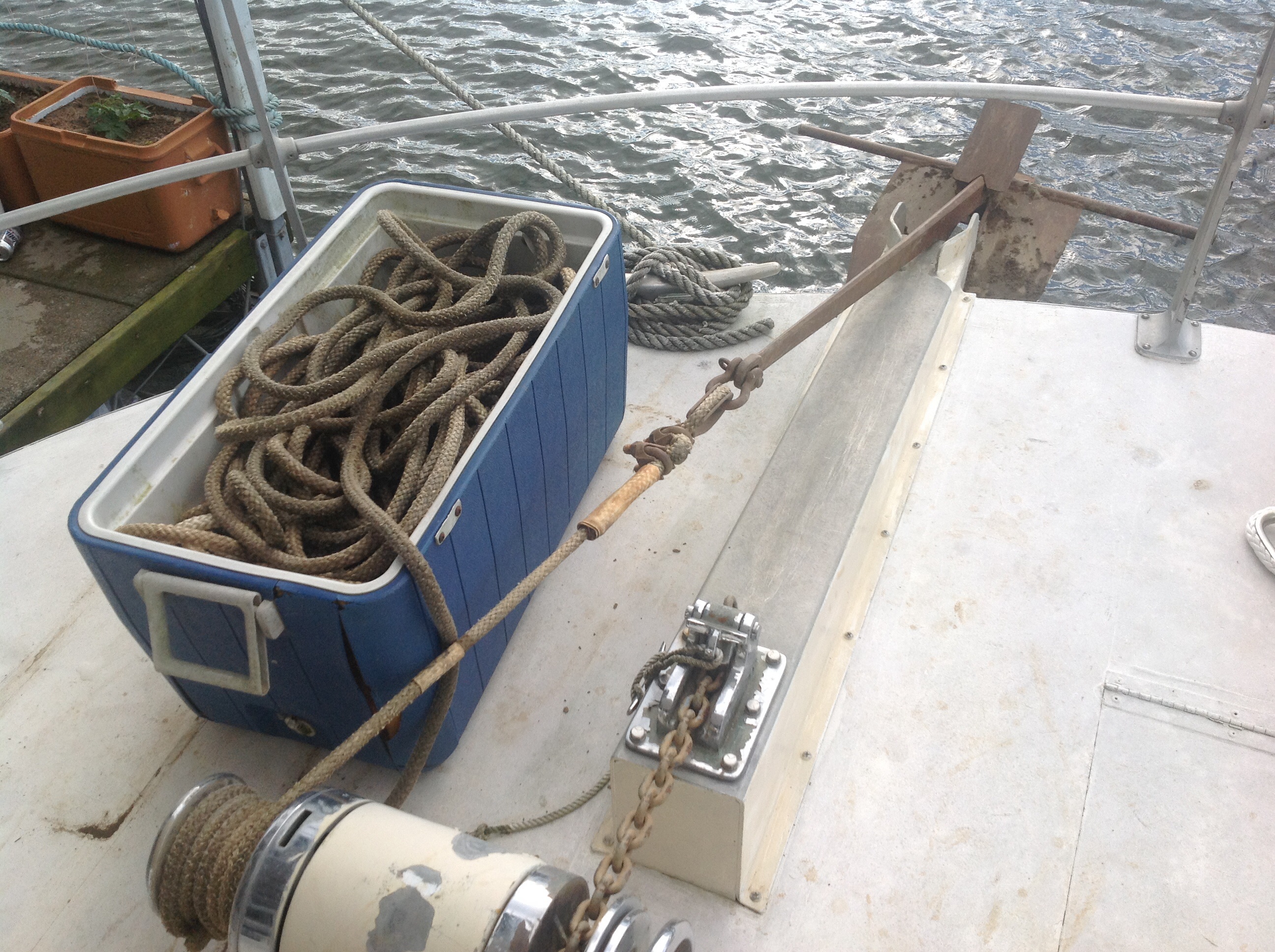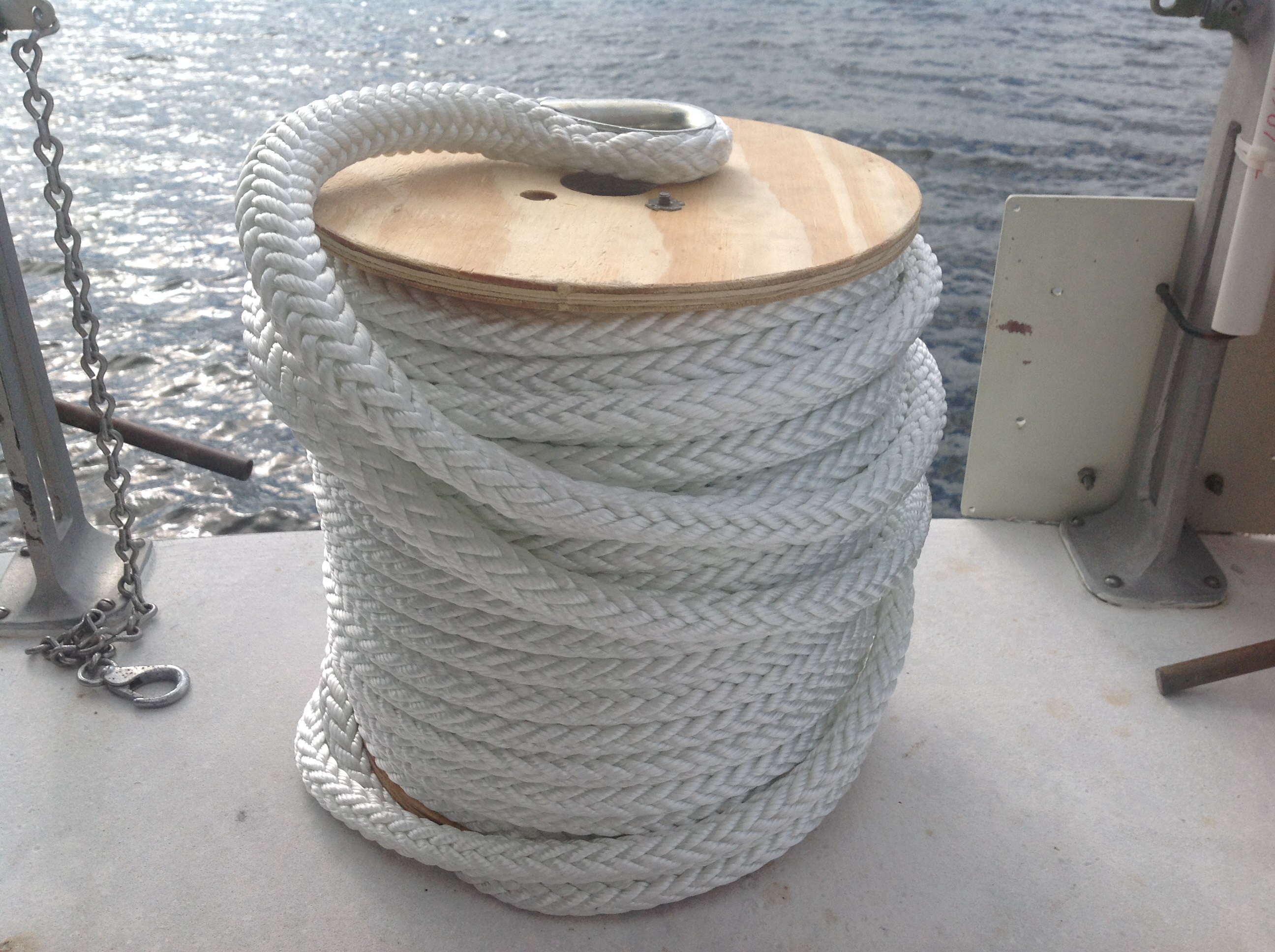 We purchased a 55′ Plukebaum a few years back and I have been been meaning to replace the old anchor line. The old line was high dollar stuff when it was purchased and it is still functional despite it being a bit stiff. The problem was that it was impossible to feed it down through the hawse pipe so it had to be stored on deck. What an unsightly mess:
